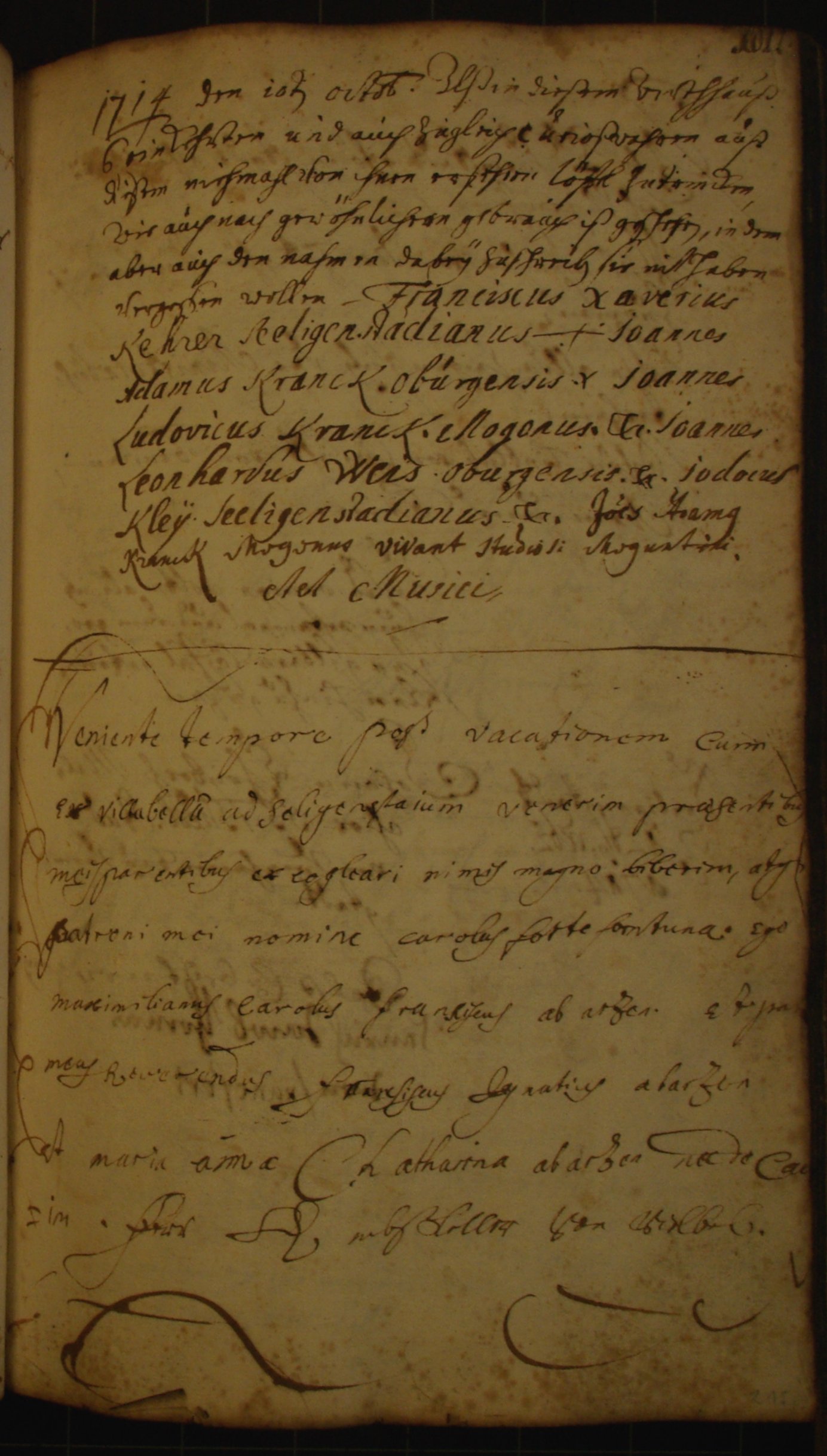 Veniente tempore post vacationem cum ex villa bella ad seligenstaium venerim pragentibus meis parentibus ex cogleari nimis magno biberim, atque patroni mei nomine carolus forte forntuna:Ego maximilianus carolus franciscus ab arzen. atque meas reverendus franciscus Ignatius ab arzen et maria anna Catharina ab arzen nee de Cain.