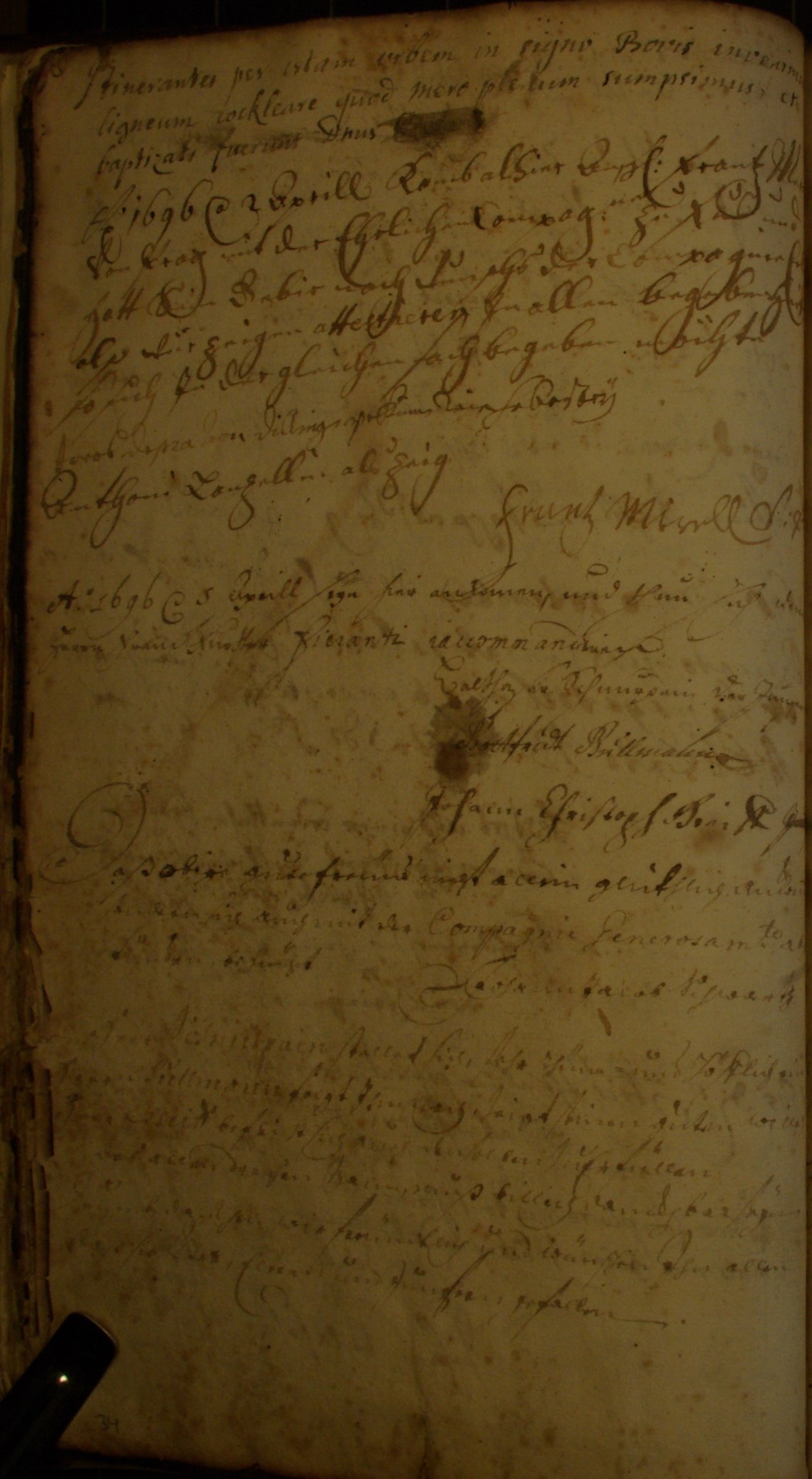 A 1696 den 2. Aprill komb alhier Augsp. frantz Merell Von Prag mit der Ehrlichen Compag:nia zu fus und hatt sein Debir nach Wunsch der Compagnie Erleistet als wie zeigen attestierenZu allen begebenheiten so sich zu dergleichen sach begeben möchte