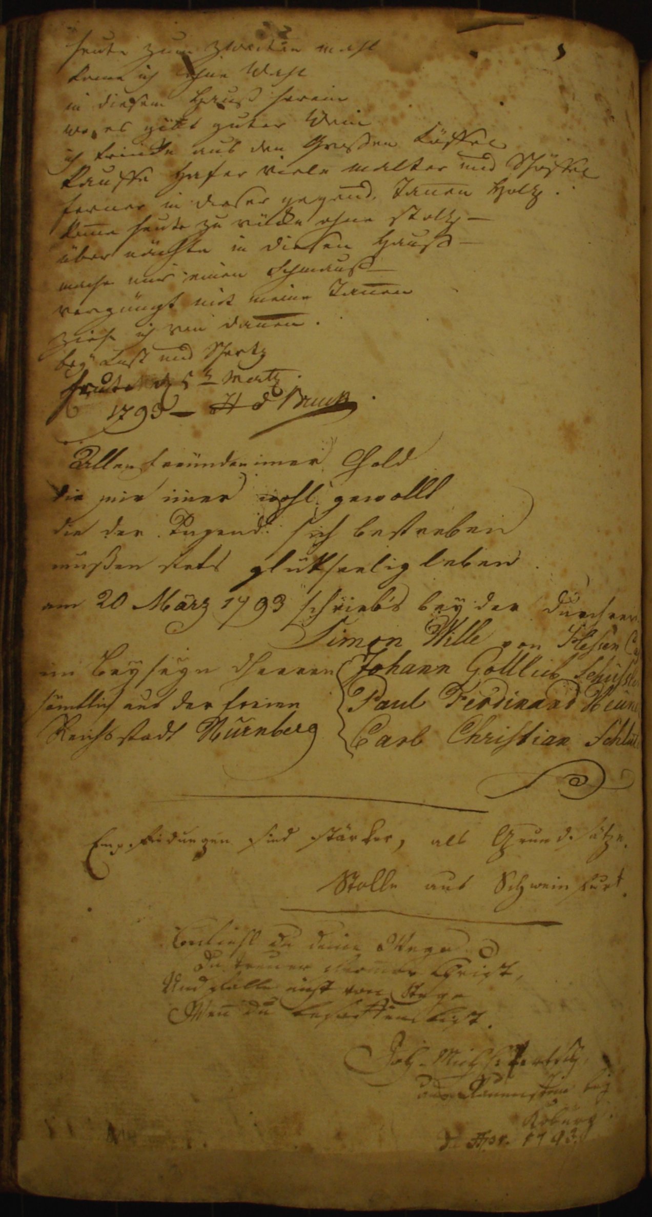 am 20 März 1793 schrieb's bey der Durchreiß Simon Wille von Hessen Cassel im beyseyn dheeren sämtlich aus der freien Reichsstadt Nürnberg Johann Gottlieb Schüssler