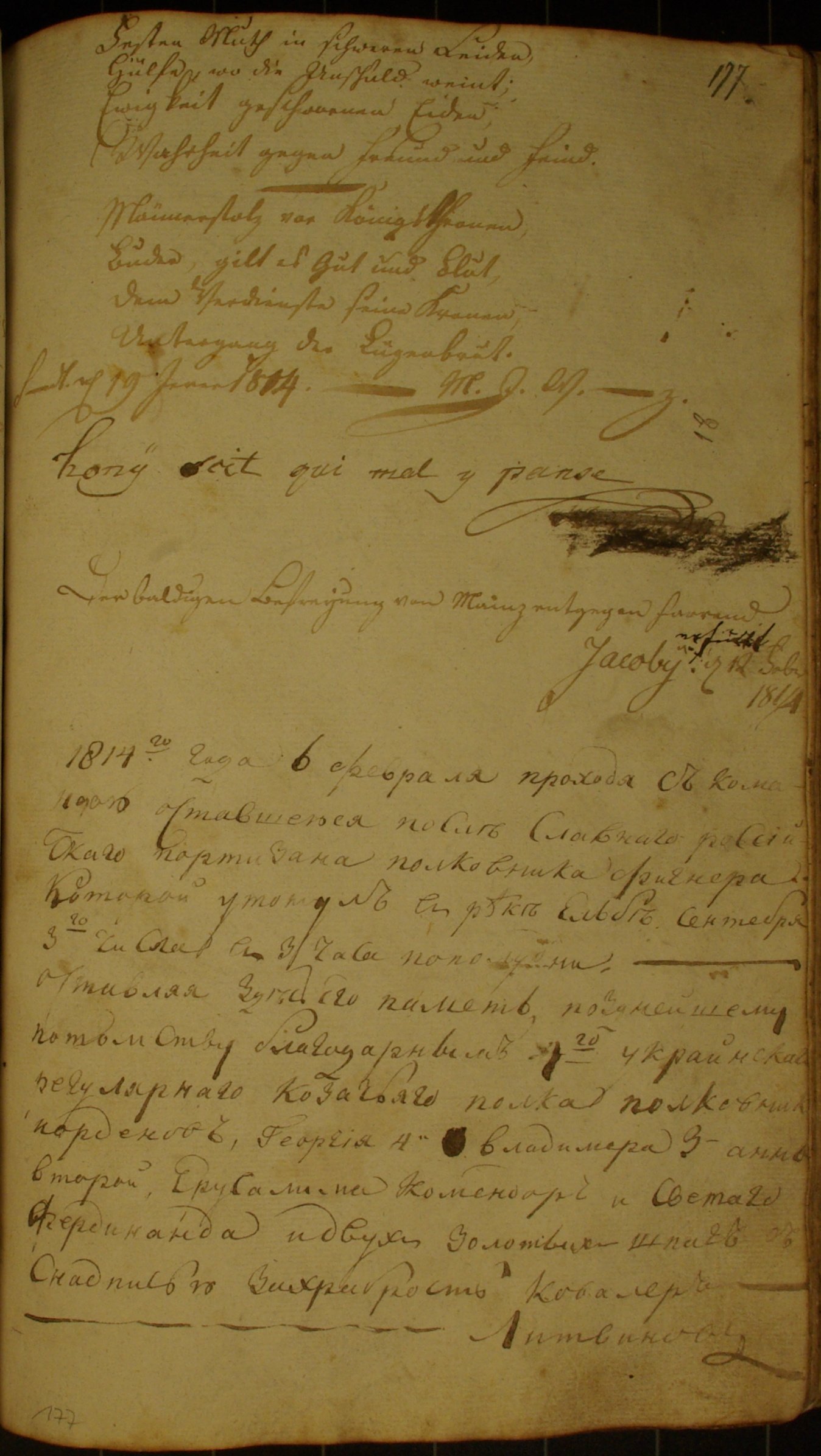 (russische Eintragung in kyrill. Schrift:) 1814vo goda 6 febralja prochodja c'komangor ostavseneja rosija Slavnago rossiutkavo portizana polkovnika fignera Kotoroi utomul' birtkij Elvdijsentedrja 3vo lista se 3 lave popludin. - ostivljaja zuevo ego pimet', poznieisemu potomsvu Semgou a rivemz d 20 ukrainchago regularnago Kozaksago polka polkovnik v toroi, ErusammaKomendor' i Svetago ferdinanda idvuchi Zolotbichi spas ov Snadpilsi Sichrisrosm' kovaler' - Litvinov