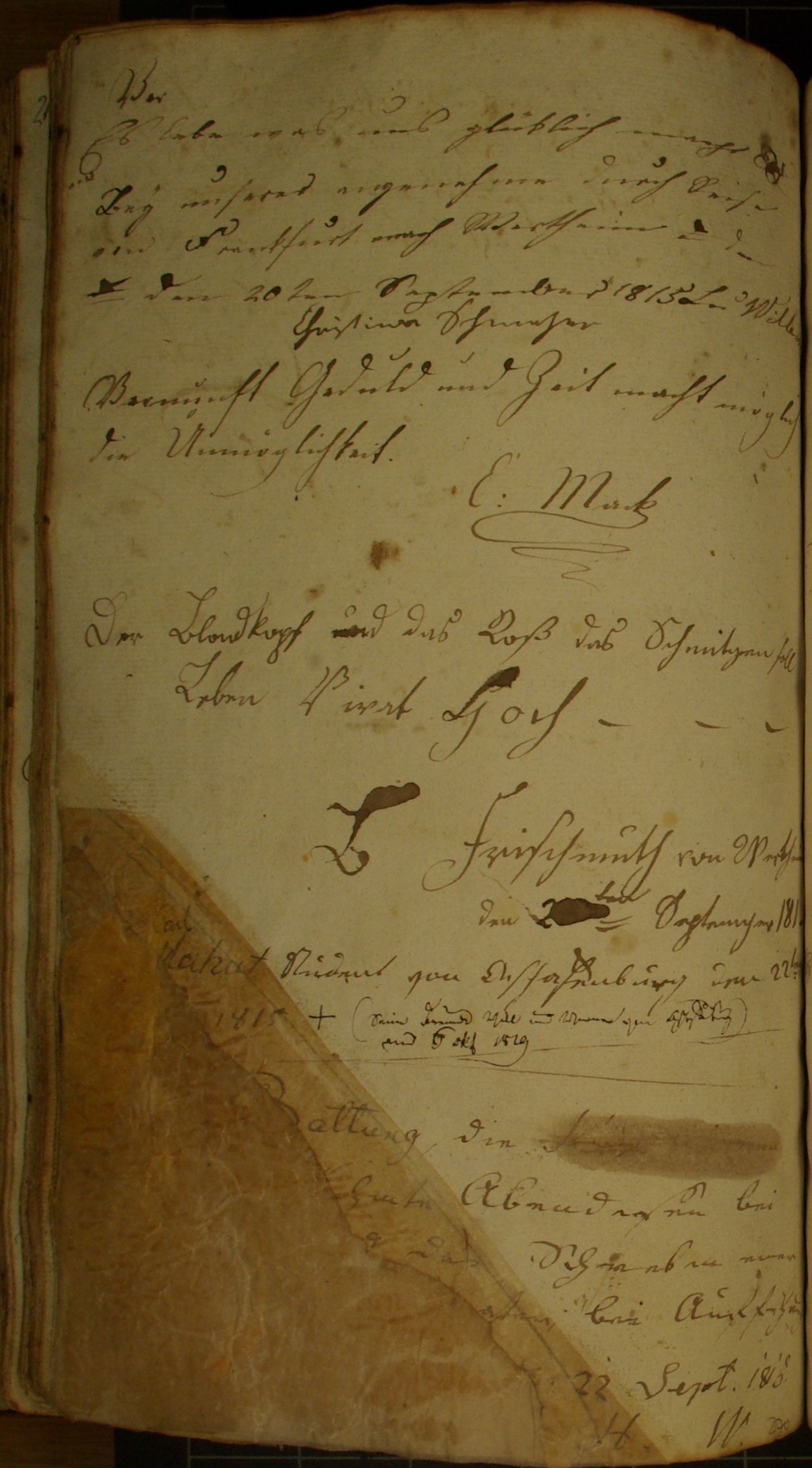 (nächste Eintragung zerstört:) (?) heute Abendeßen bei (?) das Schweben einer (?) bei Aufführung (?) 22 Sept. 1815 H. W.