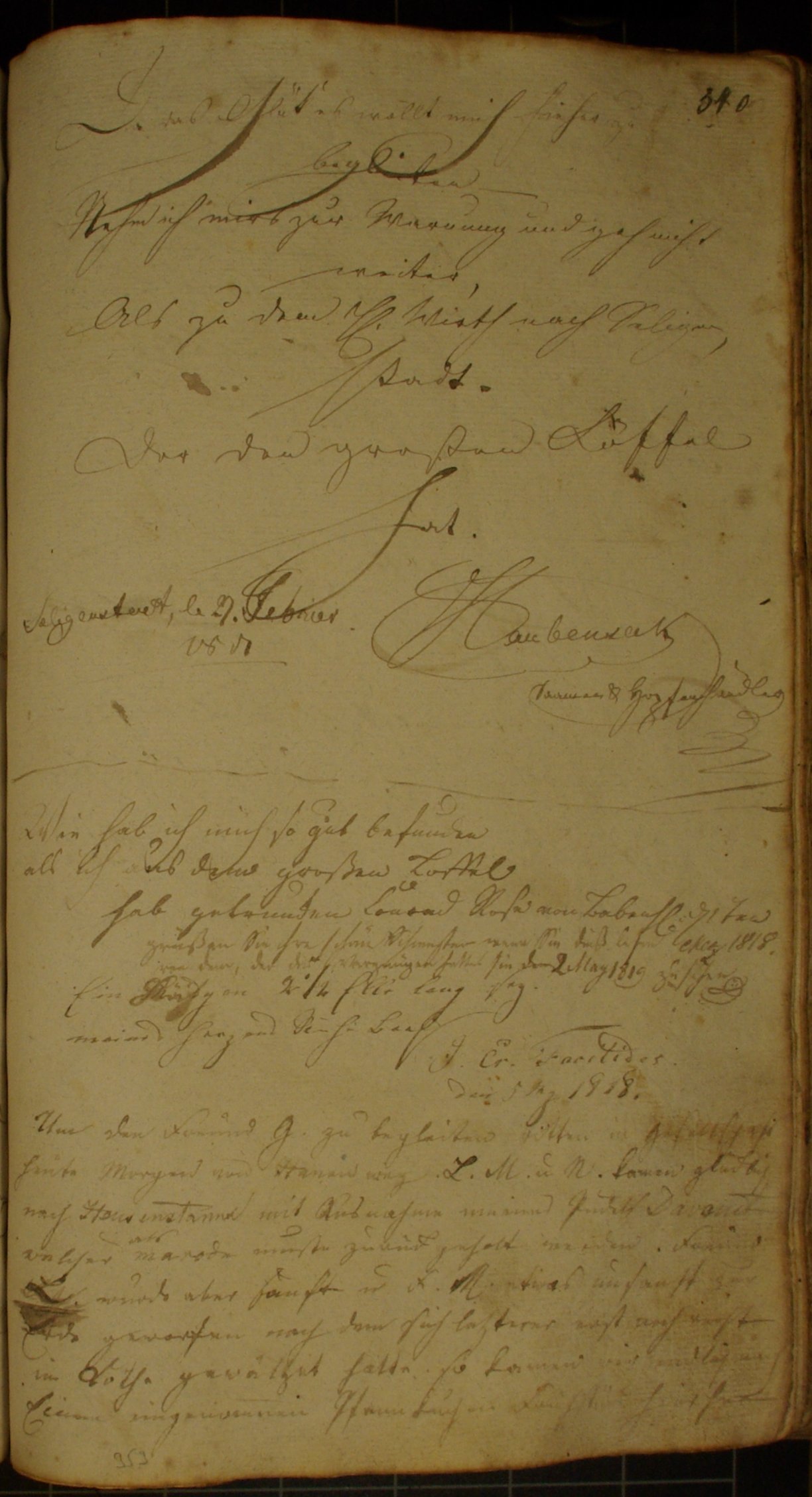 Um den Freund G. zu begleiten ritten in Gesellschaft heute Morgen von Hanau weg. L. M. u N. kamen glücklich nach Heusenstamm mit Ausnahme meines Pudels Davoudt welcher als marode mustezurück geholt werden. Freund L. wurde aber sanft u. F. M. etwas unsanft zur Erde geworfen nach dem sich lezterer erst noch recht im Kothe gewälzet hatte so kamen wir endlich nach Einemeingenommenen Pfannkuchen Frühstück hier herein