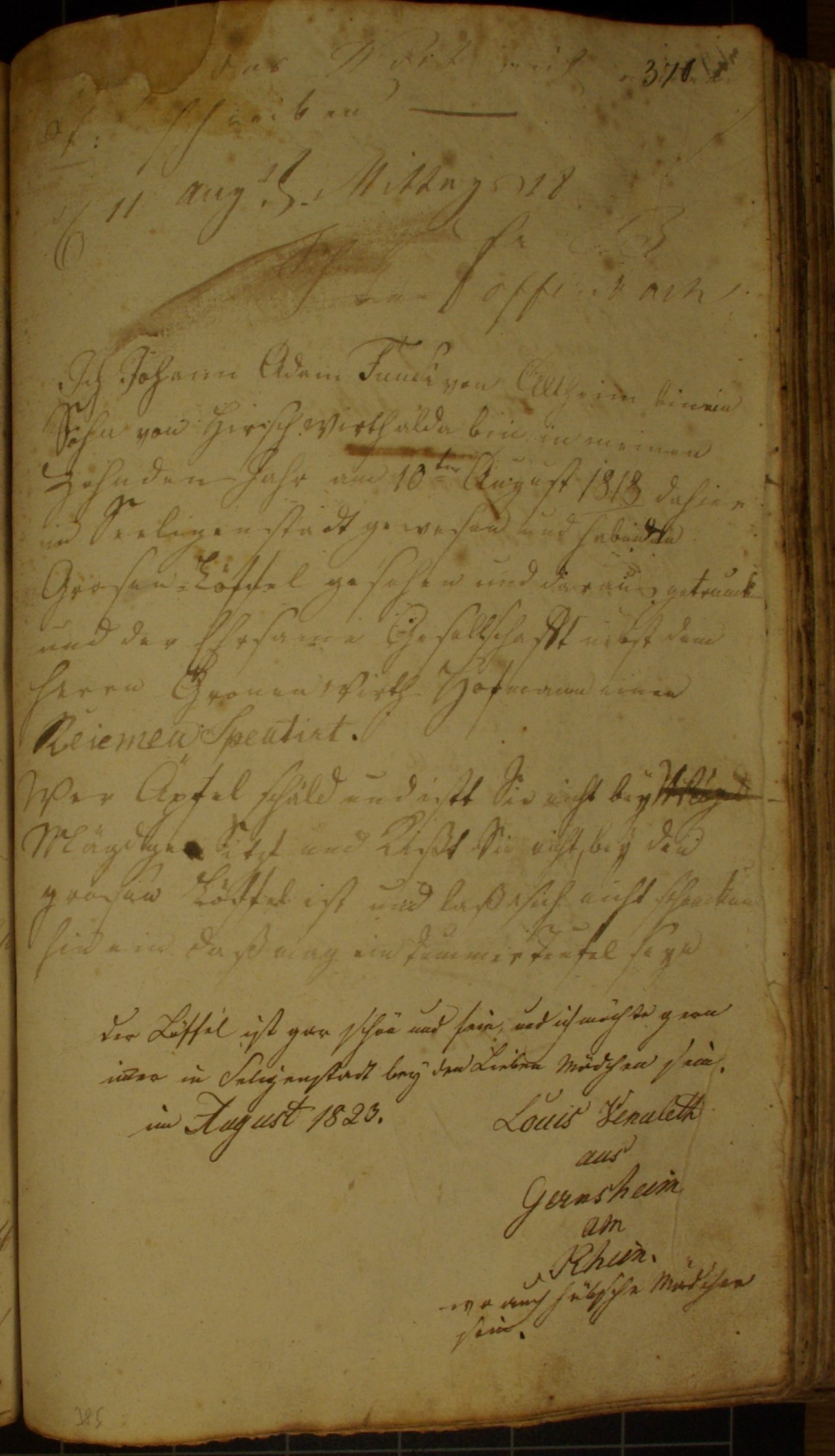 Ich Johann Adam Funck von Altheim bin ein Sohn von Hirsch Wirth alda bin in meinen Zehnden Jahr am 10ten August 1818 dahier in Seeligenstadt gewesen und habe den Grosen Löffel gesehenund daraus getruncken und der Ehrsame Gesellschafft nebst dem herrn Gronen Wirth Hofmann einen Reiemen Spentirt