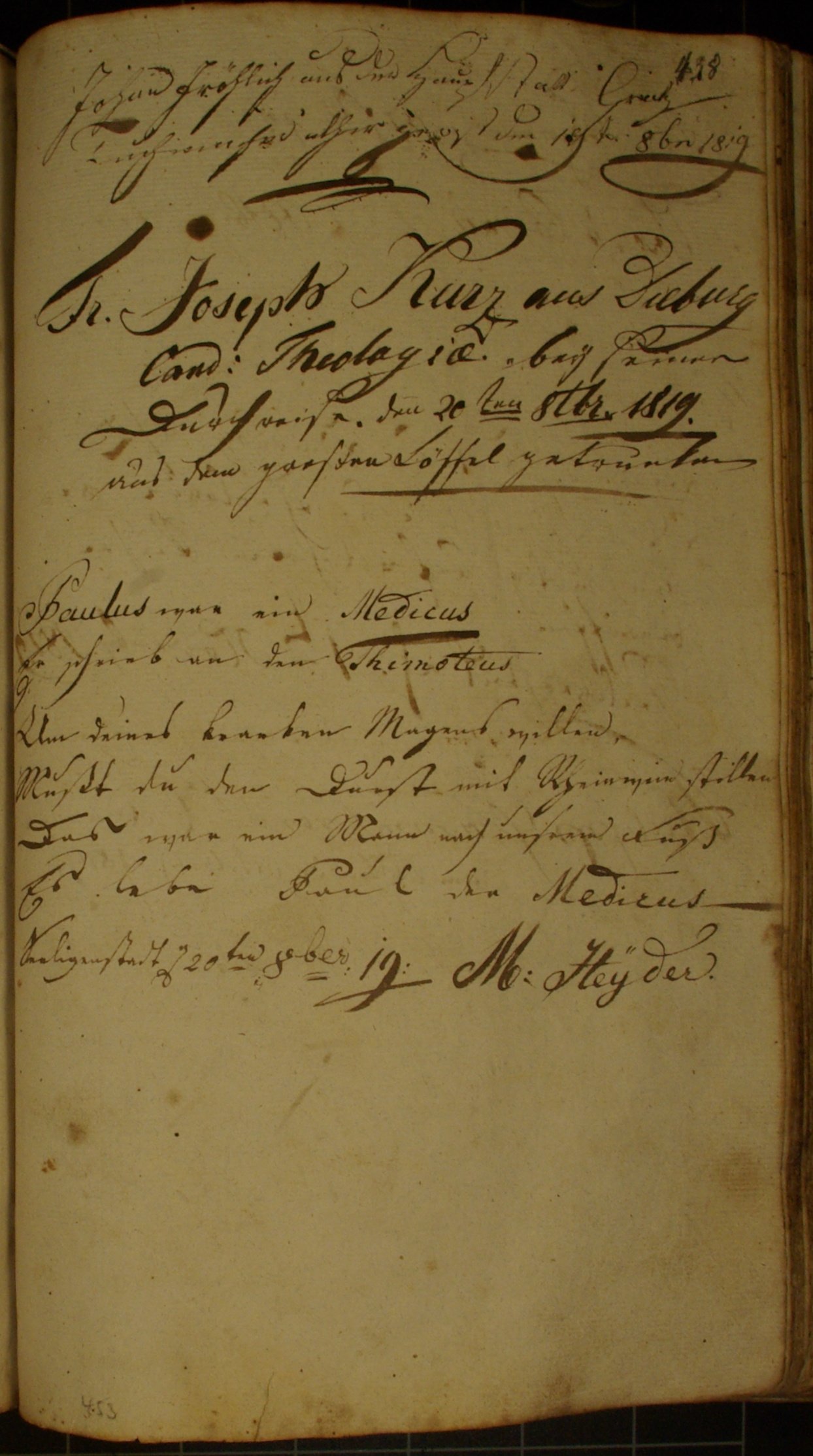 Fr. Joseph Kurz aus Dieburg Cand: Theologiae bey seiner Durchreise den 20ten 8tbr. 1819 aus dem grossen Löffel getrunken