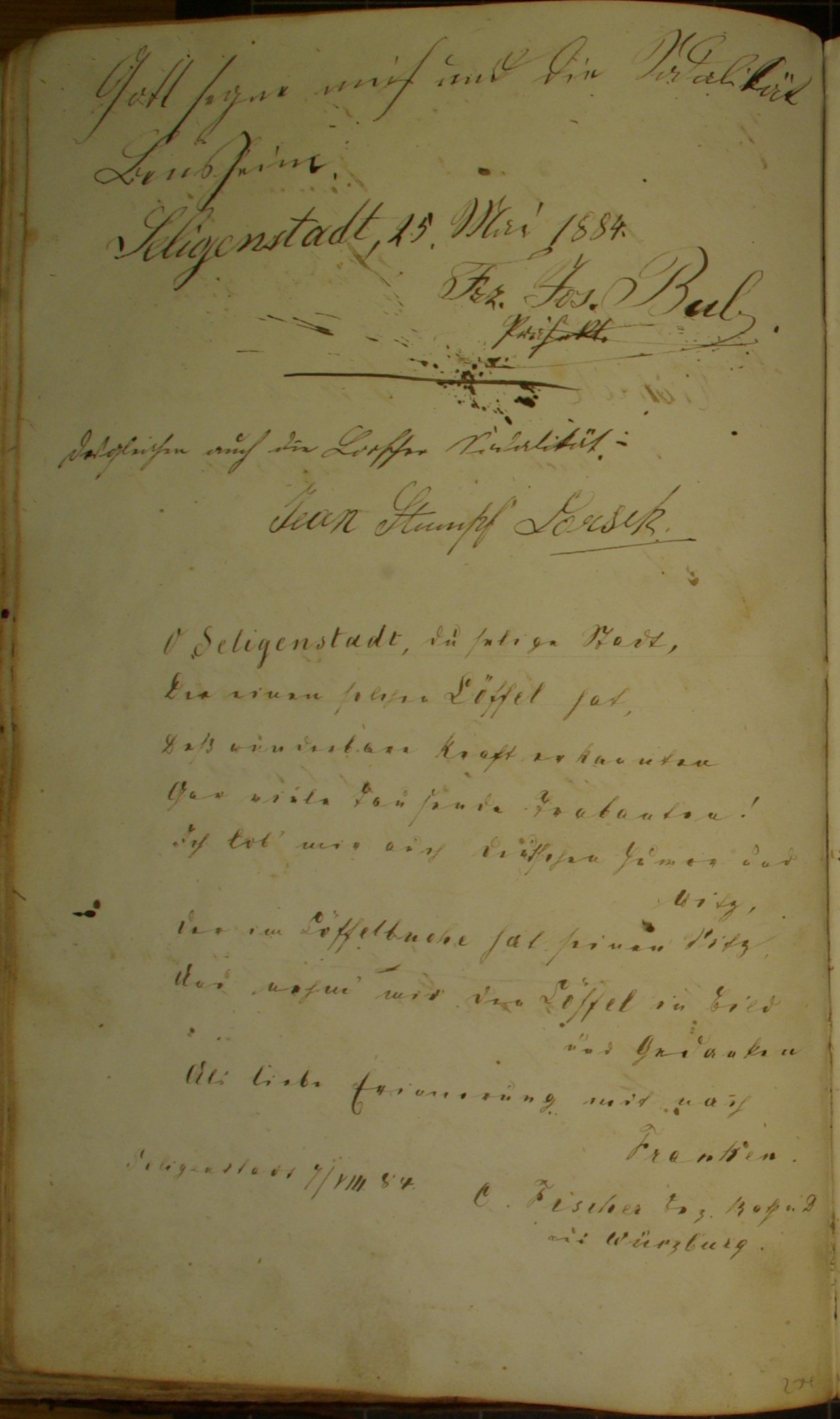 Seligenstadt 7/VIII. 84 C. Fischer Bez. Rath a. D aus Würzburg