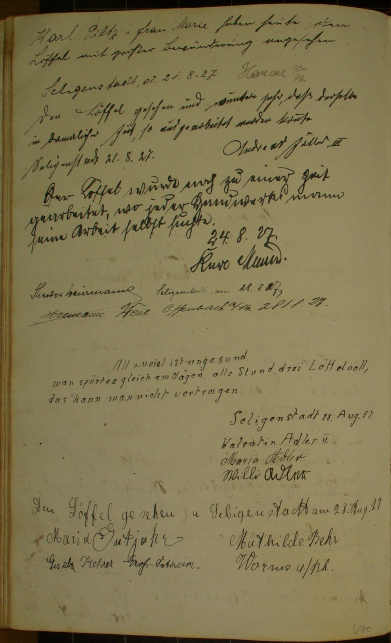 Den Löffel gesehen und wuntern sehr, daß derselbe in damalicher Zeit, so ausgearbeitet werden konnte. Seligenstadt 21. 8. 27 Andreas Zöller III