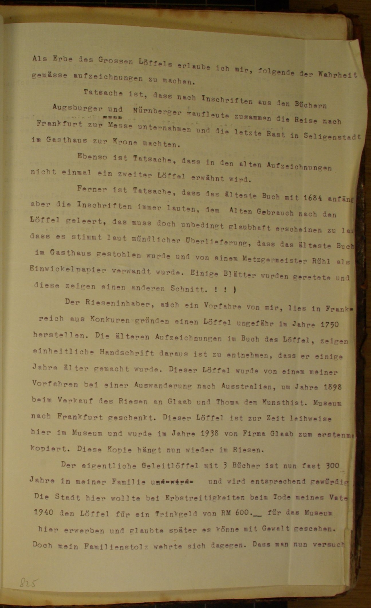 Als Erbe des Grossen Löffels erlaube ich mir, folgende der Wahrheit gemässe Aufzeichnungen zu machen. Tatsache ist, dass nach Inschriften aus den Büchern Augsburger und NürnbergerKaufleute die letzte Rast in Seligenstadt im Gasthaus zur Krone machten. Ebenso ist Tatsache, dass in den alten Aufzeichnungen nicht einmal ein zweiter Löffel erwähnt wird. Ferner istTatsache, dass das älteste Buch mit 1684 anfängt aber die Inschriften immer lauten, dem Alten Gebrauch nach den Löffel geleert, das muss doch unbedingt glaubhaft erscheinen zu lassendass es stimmt laut mündlicher Überlieerung, dass das älteste Buch im Gasthaus gestohlen wurde und von einem Metzgermeister Rühl als Einwickelpapier verwandt wurde. Einige Blätter wurdengeretete (!) und diese zeigen einen anderen Schnitt!!